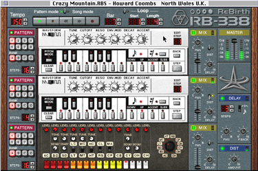 For those with a fetish for the 303 sound but without the money to front for their own 303, Propellerhead has produced a godsend: an inexpensive piece of computer software that closely emulates the sound of the 303. A group of German engineers took apart a 303, studied its circuitry, and wrote mathematical functions approximating the effect of each individual element (capacitors, transistors, etc.) on current and voltage. They then implemented these equations in a piece of digital software that models the circuitry of the device. Combining two 303-synthesis modules and and 808-synthesis module (the 808 is one of Roland's analog drum machines) into a single panel on the computer screen, they have marketed the product (at a price of about $150) for nearly a year with the name ReBirth RB-338.